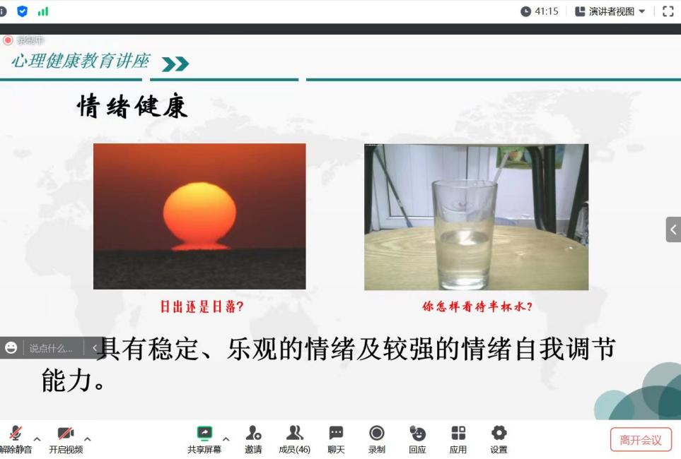 李秋丽教授通过心理状态评估小测试让老师们对自己的心理状态进行简单的评估,并指出“认识自己、了解自己”是正确对待自身心理健康问题的第一步。她介绍了异常心理状态的演变和调节方法,详细讲解压力对教师生理心理的影响、教师压力的来源以及压力与压力感的差异等。接着,李教授从自我调节入手,探讨情绪管理话题,分享情绪调节和压力管理的心理策略。