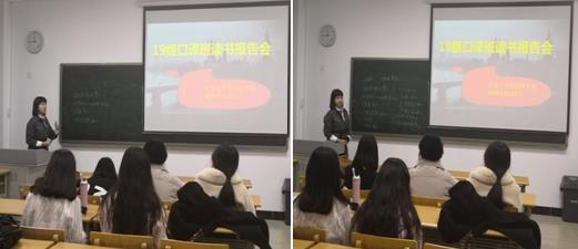 110教室举行读书报告交流会,19级口译班全体同学参加;报告会由闫贵宇同学主持,张灿、陈嘉敏、曹青、黄冕、闫贵宇等五位同学分享了自己的读书心得,现场气氛活跃,大家积极思考交流,就相关学习领域进行了深刻探讨。