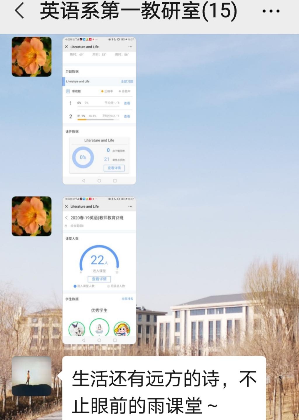 三、整合网络平台,注重教学效果。依托学校“雨课堂”在线课程平台及相关教学平台,如腾讯会议,“雨课堂+腾讯会议”、腾讯课堂、智课堂、超星学习通等,利用上线的慕课和各类优质在线课程教学资源,开展线上教学,进行远程指导。各任课教师采用直播、录播、录播+直播、MOOC等教学模式,配合微信群、QQ群等形式辅导答疑,保障线上教学有序进行,尤其是公外部骨干团队录制的《大学英语视听说IV》慕课于本学期在雨课堂正式上线,丰富了线上教学的模式。在为期一周的教学过程中,教师和学生基本熟练掌握了网络教学手段的应用,互相交流教学经验,通过各种手段和方式以达到以学生为中心的教学效果,营造了浓厚的学生学习氛围,得到了学生的普遍认可。