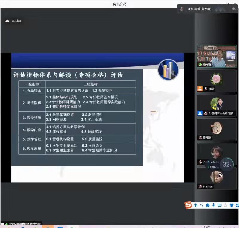 接着,赵老师解读了专业学位评估的基本原则和评估指标体系,并以广外高翻学院翻译硕士学位论文为范本,向大家讲解了翻译硕士学位实践报告(论文)的写作要求,以及学位论文抽检评价要素和评价标准等。