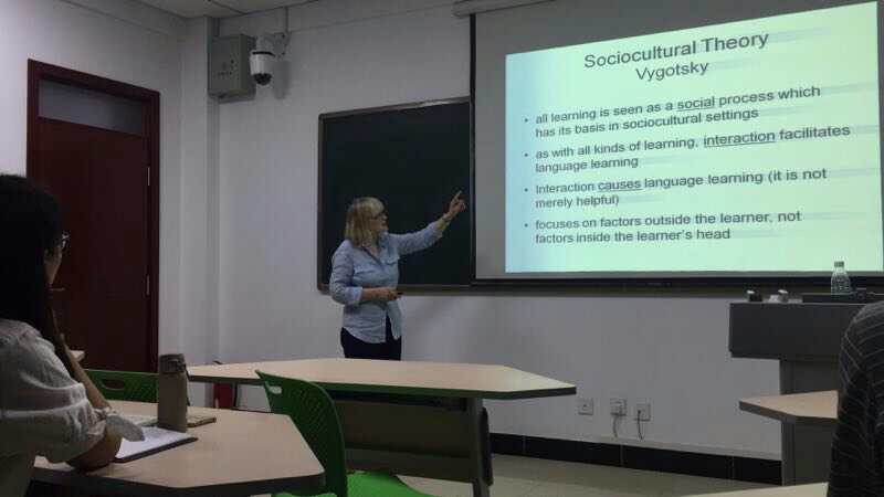 教师做了题为“How do we learn language?”的学术讲座。Dr.Aileen 在讲座中主要介绍了四位语言学的大师在语言学方面的主要贡献以及他们的主要语言学习思想和观点,并提出了自己独特的见解。整个讲座深入浅出,风趣幽默,在座的老师们结合自己的教学实践和Dr.Aileen频频互动、踊跃提问,探讨语言教学的相关问题,Dr.Aileen一一给与了耐心解答,讲座在大家热烈的掌声中圆满结束。