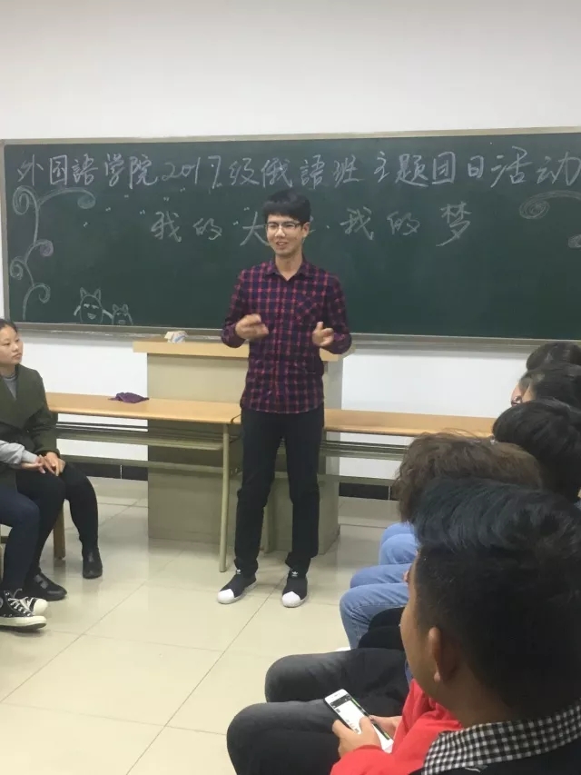 2017级俄语班团支部组织的“我的大学,我的梦”主题班会在学院124教室举行,班会由王慧君、李崧源同学主持,班主任马雅琼老师以及学长学姐们参与其中,倾听各位同学畅谈自己的大学梦。