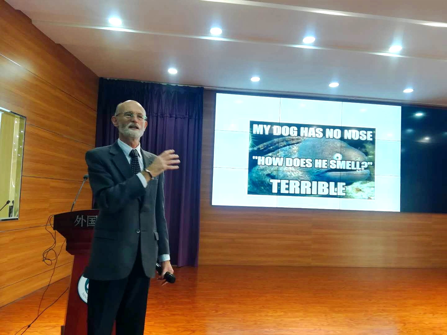 讲座过程中,Colin Beaven 教授分别从广告、新闻、照片、电影、小说等多个角度举例,对“humor”的意义进行了阐释。这些例子生动形象,或展现世界观、或体现文化底蕴,同学们一方面被教授的幽默所感染,另一方面也为教授广博的知识所折服。此外,教授还建议同学们通过听力训练、论文写作等方式提升英语能力。Colin Beaven 教授渊博的知识和睿智的谈吐赢得了在座师生的阵阵掌声。