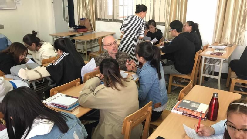 外教协商, “外教进大学英语课堂”活动于2018年3月28日早晨7:40正式开课。活动由Dale De Weerd、Sarah Beth Harmon、Carolyn Stent、Bob Cheah四名外教分为两组分赴2017级非英语专业本科生的大学英语课堂进行教学。