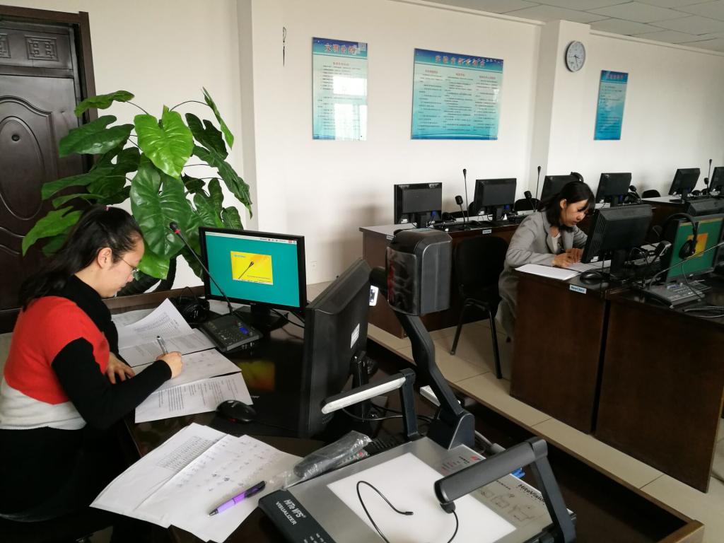 学生的英语风采。为确保比赛的公平公正性,比赛开始前,田莎老师对比赛规则和注意事项做了详细说明。比赛内容为: 一篇英译汉,一篇汉译英材料,在听到提示音后进行翻译,限时50秒。前三组同学比赛结束后,两组老师在205教室集合讨论评分标准,以便对选手的表现做出客观、公平的评价。