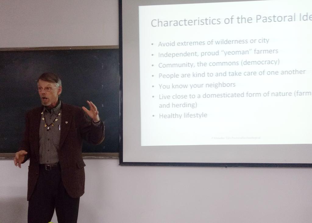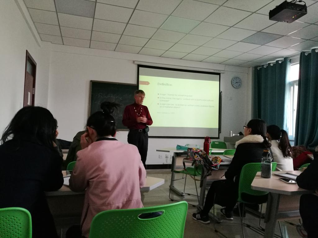 开始授课,主要包括两门选修课,内容涵盖美国历史、地理、人文等领域。此外,Pat教授还与外院研究生导师共同为研究生合作授课,使学生们能够在中英双语语境中开展语言学习。在授课过程中,Pat Munday教授运用ppt和图片展示相结合的教学方式,并穿插一系列相关故事情节作为拓展,使得同学们更好地融入课堂。此外,Pat教授还带领同学们进行小组讨论,让同学们各抒己见,自由交流。让同学们在学习美国历史文化的同时也锻炼了口语表达能力。