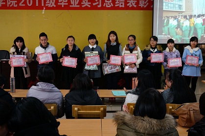 会议首先由瞧秀梅副院长就本学期实习工作的基本情况、存在的问题、取得的成绩做了全面的回顾和总结,表扬了一些在实习中责任心强,工作认真主动的同学。这些同学不仅自己取得了优秀的成果和宝贵的经验,也为学院做了合格的代言人。