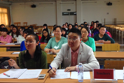 此次口译实践活动由2014级口译专业学生马秀发起并组织,其他三名同学马根蕾、王滋惠和雷霞分别担任主持人和口译员。学院在学生自发组织的实践活动中给予了大力支持,提供了前期宣传、接待、场地、摄像支持。全体师生观摩了此次活动,口译授课教师田莎、孔明对学生的现场翻译做了全程记录并予以点评。