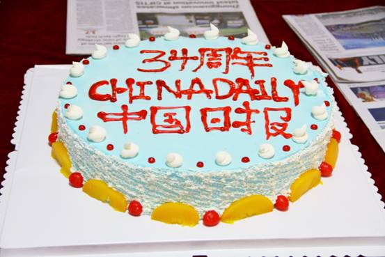 双方代表一同切好蛋糕,并与在场来宾一起分享,庆祝中国日报社成立34周年。
