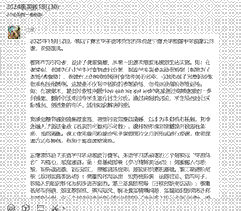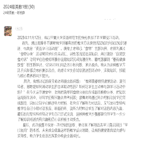 见习学生认真观摩、细致记录,对教师在课堂中运用的“情境教学”及“多媒体融合”等教学策略印象深刻。观摩结束后,班主任文莉老师及时组织教学研讨。研讨分为两个阶段:第一阶段为现场研讨;第二阶段根据研讨中大家的反馈和提问,思考后进行线上总结和分享。同学们踊跃发言,充分肯定本节课在目标落实、活动设计与学生参与方面的亮点,同时也结合自身理解针对词汇准备、文化意识提升等方面提出建设性思考。有的同学在交流中说:“教学是生命对话的艺术”,有的说:“这节课体现了英语教学与生活教育的有机结合,一堂好的英语课不仅要教会学生语言知识,更要为学生打开一扇了解世界的窗户”,有的说:“未来会让自己的课堂更具层次感与实效性,助力学生在语言探索中收获全面成长”,还有的说:“老师扎实的功底,对课堂的掌控力,都让我非常敬佩。在今后的教学中,我会学习这位老师的教学本领,做一个好老师”。通过现场研讨和后续的线上分享,同学们在互动中深化了认识,在反思中提升了见解。