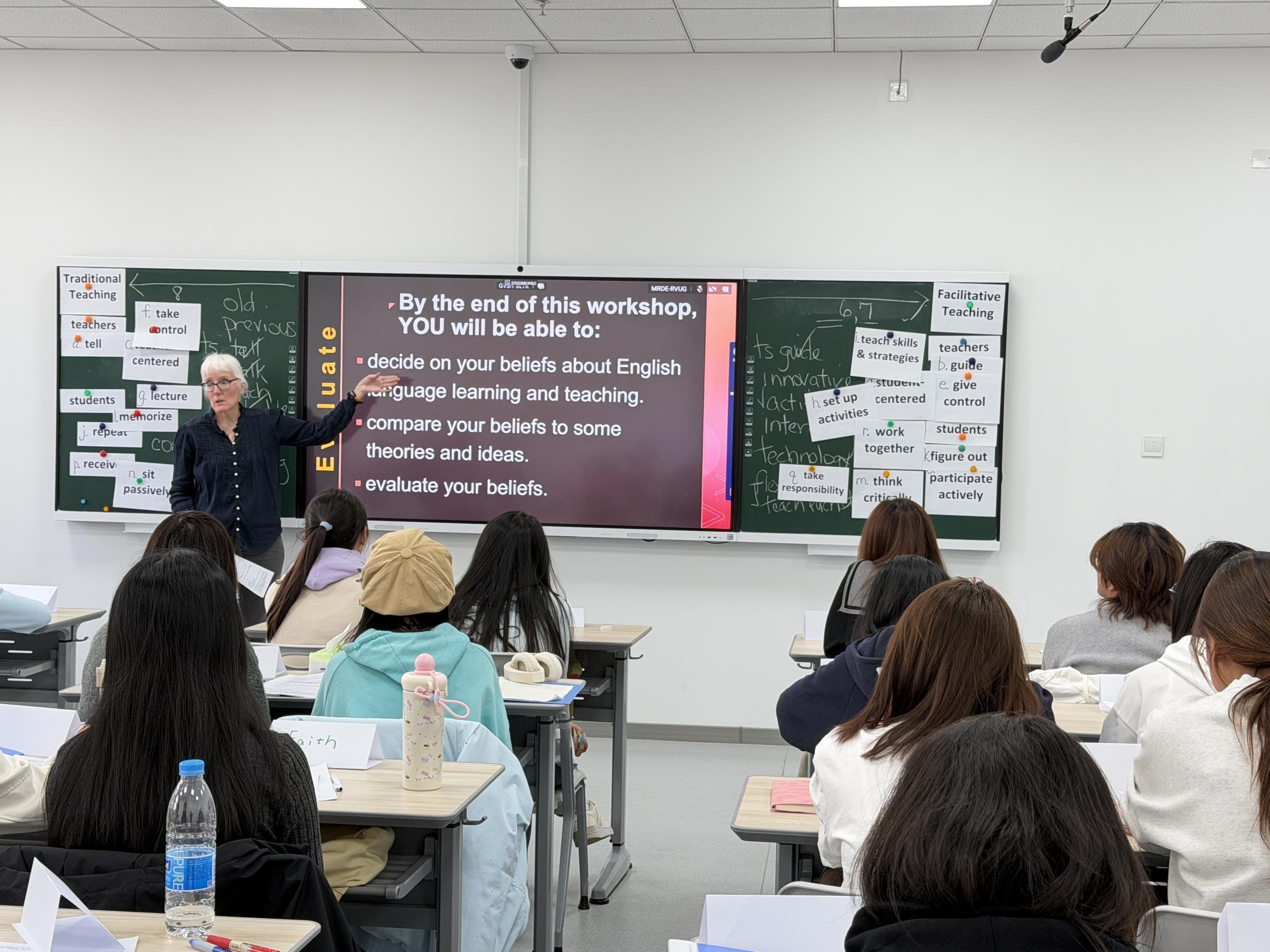 在贺兰山校区笃行楼207教室和407教室,分别为2025级英语师范1班和2班学生举办了“卓越教师培养计划”首场教学工作坊。本次工作坊以“Beliefs about English Language Teaching and Learning”为主题,特邀英语教学法领域专家Melissa K. Smith博士主讲,旨在引导未来教师审视并重构自身教与学的信念,为后续课堂实践与教学研究奠定扎实基础。